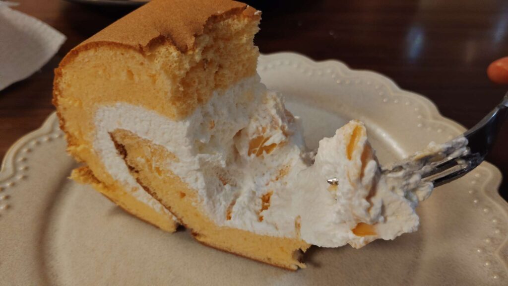 生クリームはとても軽く、甘さは控えめ。コクはあるのに後味がすっきりしていて、気づいたらもう一切れ食べたくなるおいしさでした。