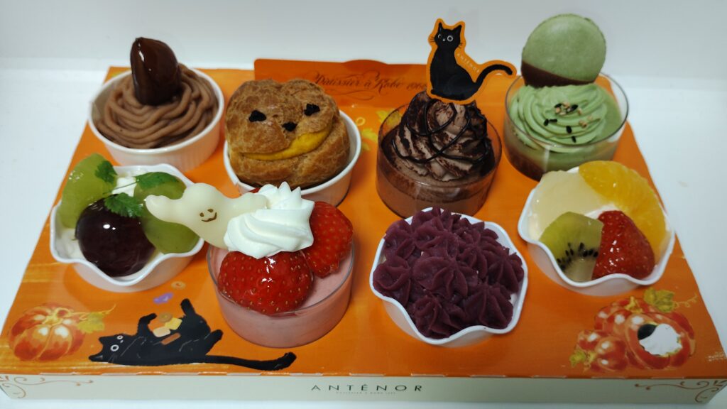■内容:モンブラン、パンプキンシュー、ショコラ、小倉抹茶、ぶどうのレアチーズ、苺のムース、むらさき芋のモンブラン、フルーツババロワ
