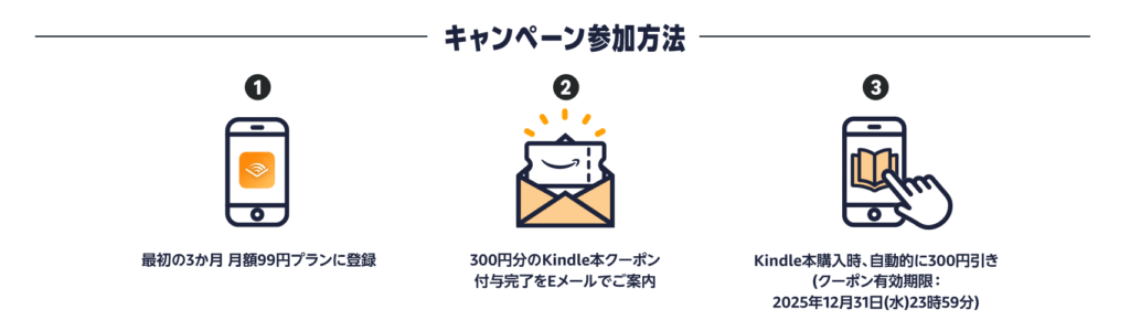 【2025年12月1日まで】Audibleプレミアムプランが最初の3か月月額99円!さらに今なら300円分のKindle本クーポン特典