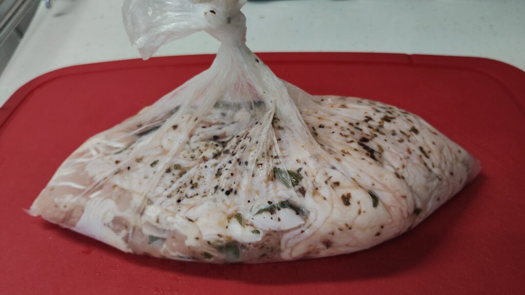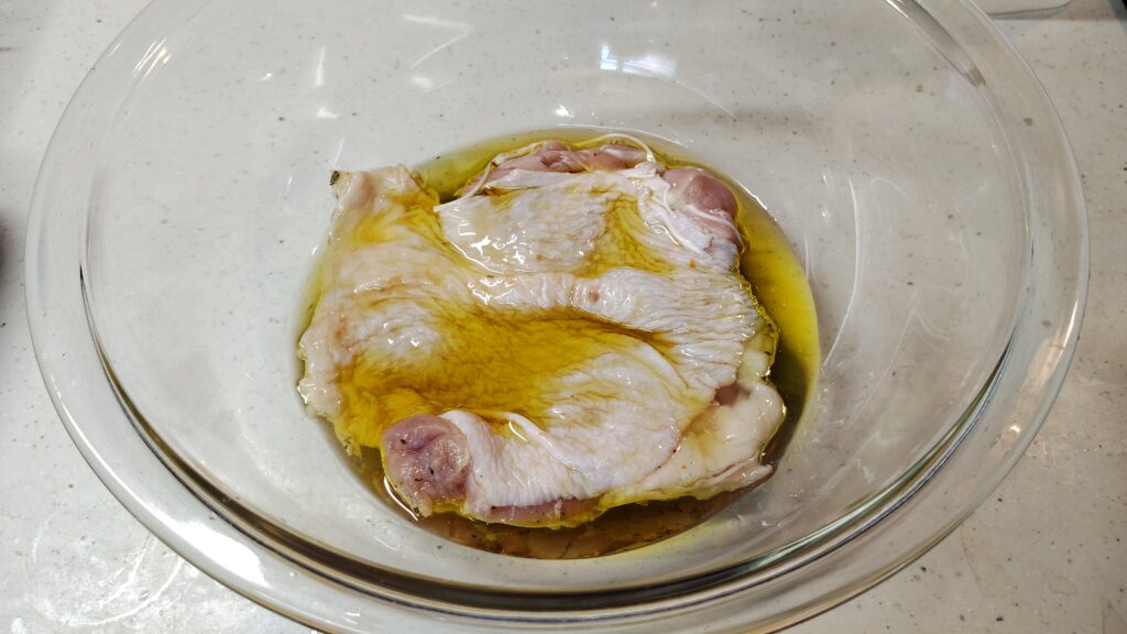 個人的には、一晩漬けこんだ鶏肉(ハーブ)を洗い流さないで、そのままガラスボウルに入れ、オイルと一緒に加熱する方法がおすすめです。手順も減ってラク&塩味もしっかりつき、おいしく仕上がります。
