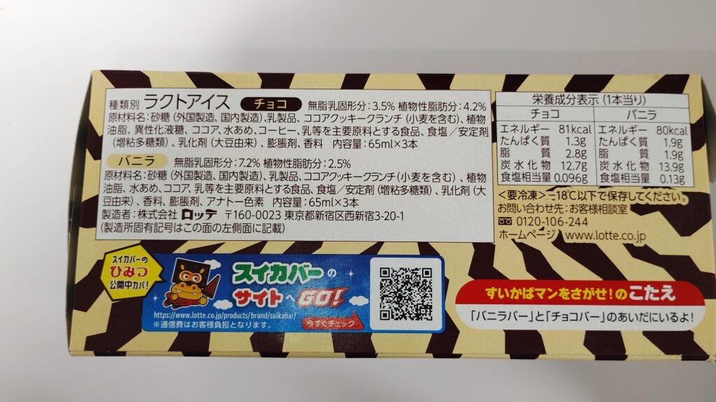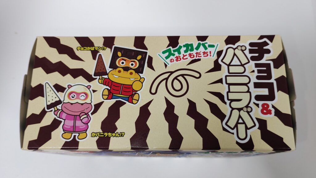 箱アイスの裏面には「スイカマンを探せ!」の遊び心あるデザインが。春夏に登場したスイカマンが、秋冬の「チョコ&バニラバー」でも楽しめるのは嬉しいポイントです。小さな楽しみが詰まったパッケージで、食べる前からワクワク感が広がります。