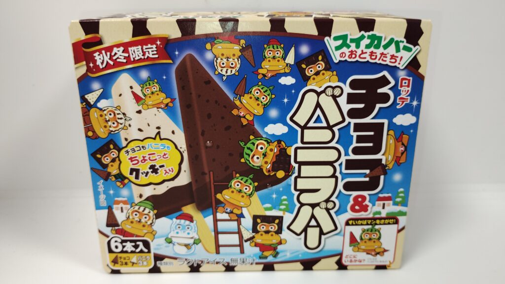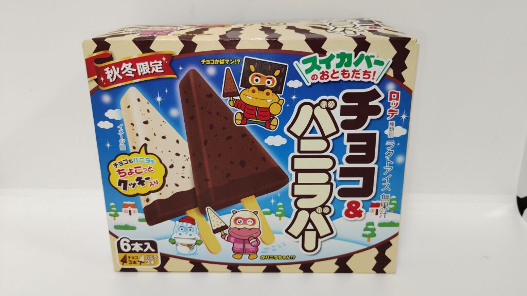 秋冬限定で登場する「チョコ&バニラバー」は、人気アイス「スイカバー」のおともだちとして毎年注目される箱アイスです。2025年も9月29日(月)より全国で発売され、店頭で見かけて早速購入しました。