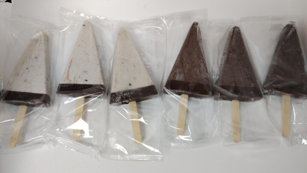 ▲夏のスイカバーと比べてみました。形は似ていて、チョコで冬仕様に変身!