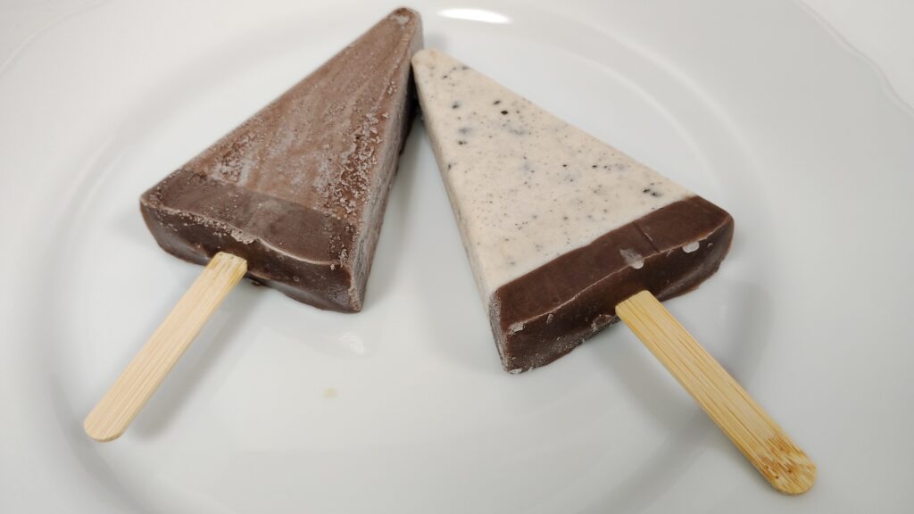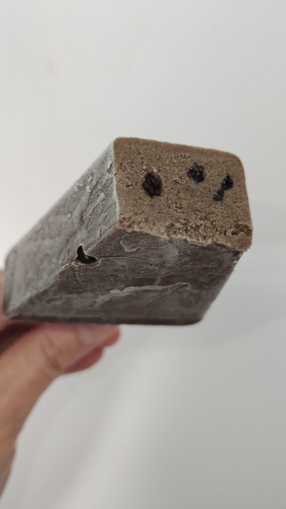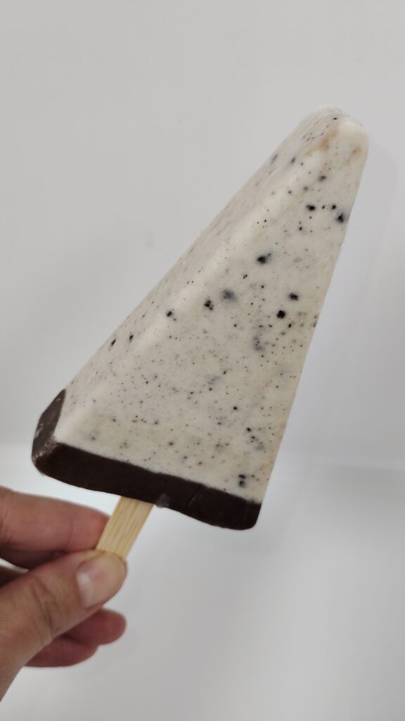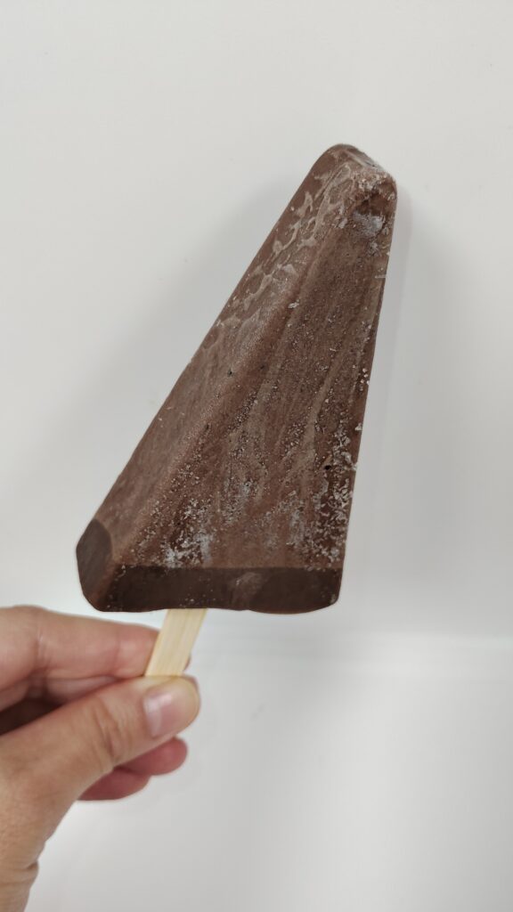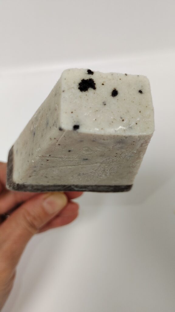 食感はスイカバーに似ています。冷たく固めのアイスが口の中で溶けて、クッキー&バニラの味わいが広がります。チョコ味と同じく、下の茶色い部分はさらに固めでシャリっとした食感。冬場なので、特に冷凍から出したてはカチカチですが、食べているうちにちょうどよくなります。
