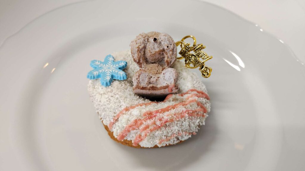 華やかな白を基調にしたクリスマスドーナツ。トッピングはココナッツ風味です。雪のようなコーティングが美しく、クリスマスケーキのような上品さがあります。