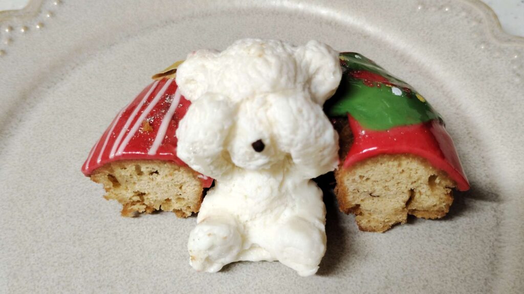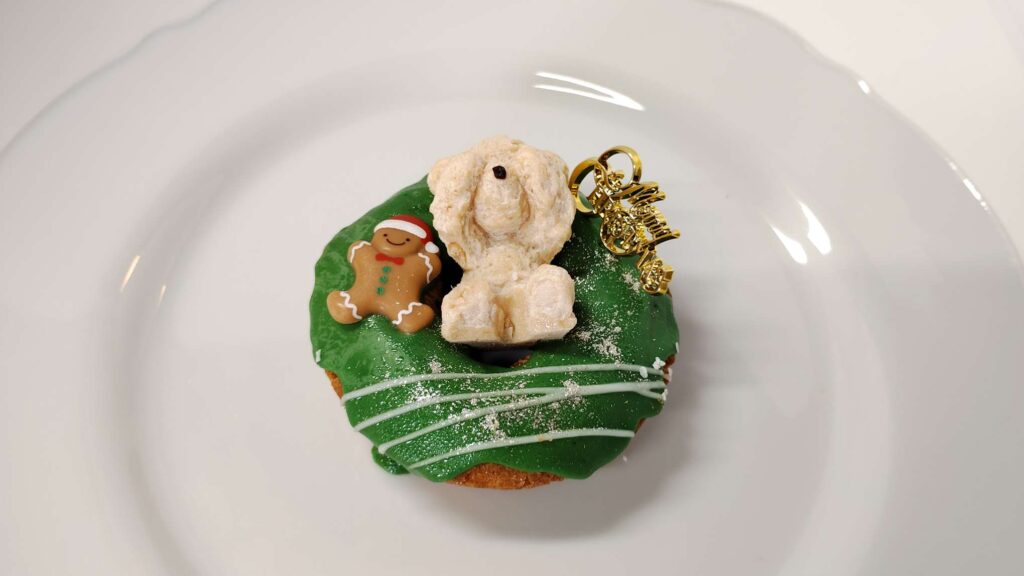 こちらはテディジンジャークランチ(ホワイトチョコ)がのっています。小さなクリスマスリースのトッピングがたまらなくかわいい!