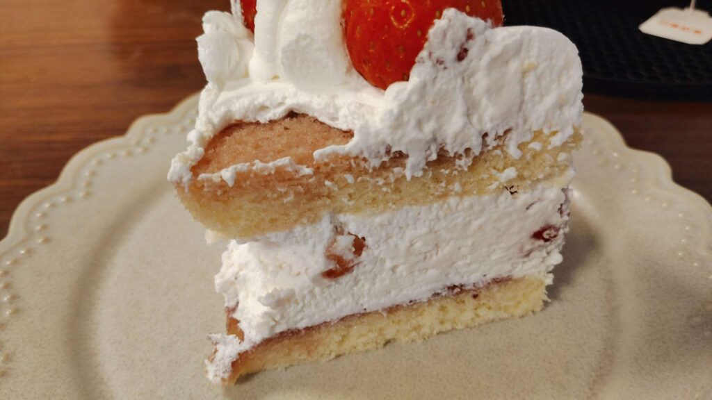 スポンジケーキは上側が薄ピンク色のほんのりいちご風味になっていました。