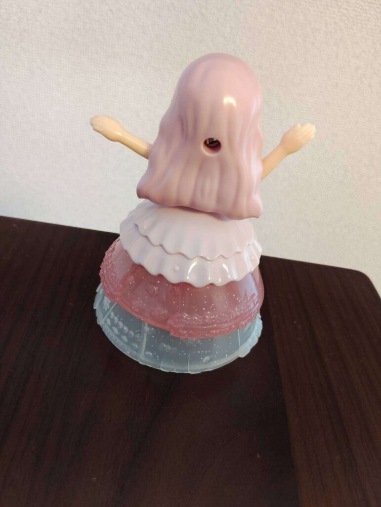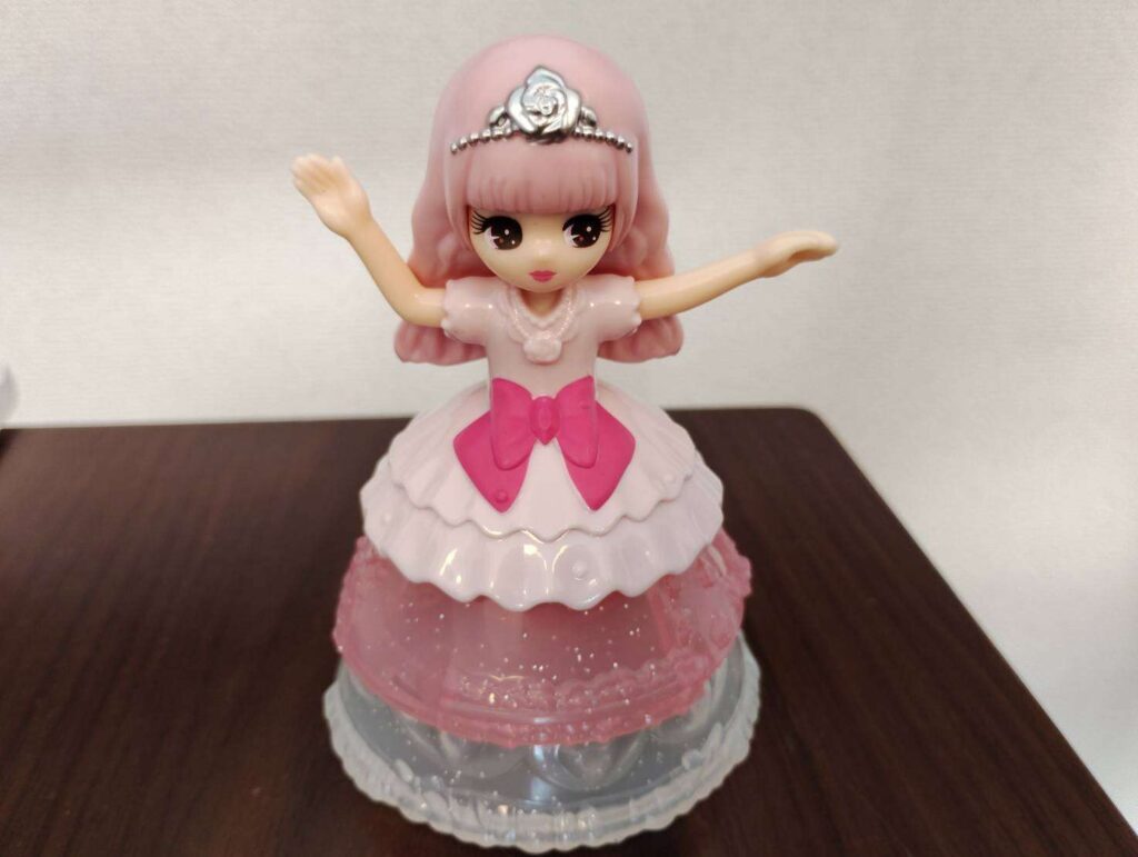 シークレットリカちゃんは、ピンクのロングウエーブヘア、ピンクと白のラメ入りドレスを着ています。バラのティアラとバラのネックレスを身に着けています。