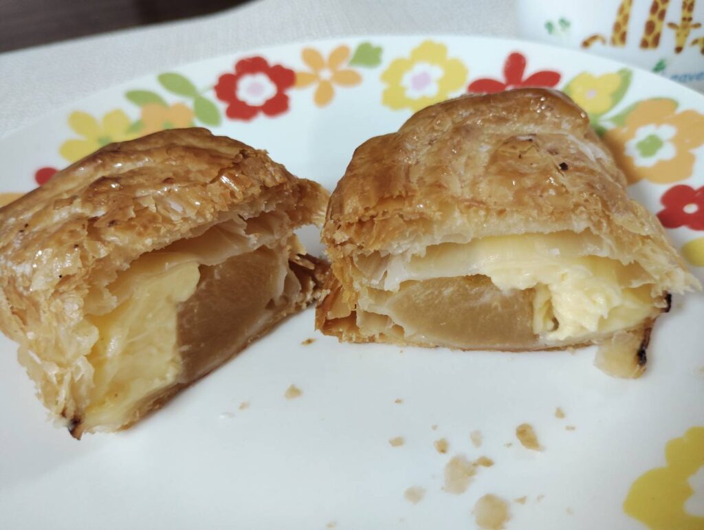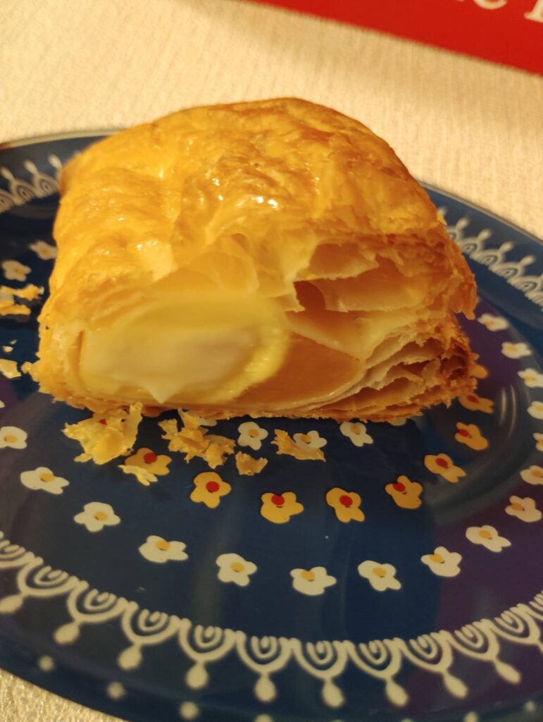 パイ生地は層がしっかりしていて、噛んだ瞬間サクッ!かぶりつく食べ応えもあります。中のフィリングはとろりとしたカスタードクリームがたっぷり詰まっていて、口の中でとろけます。