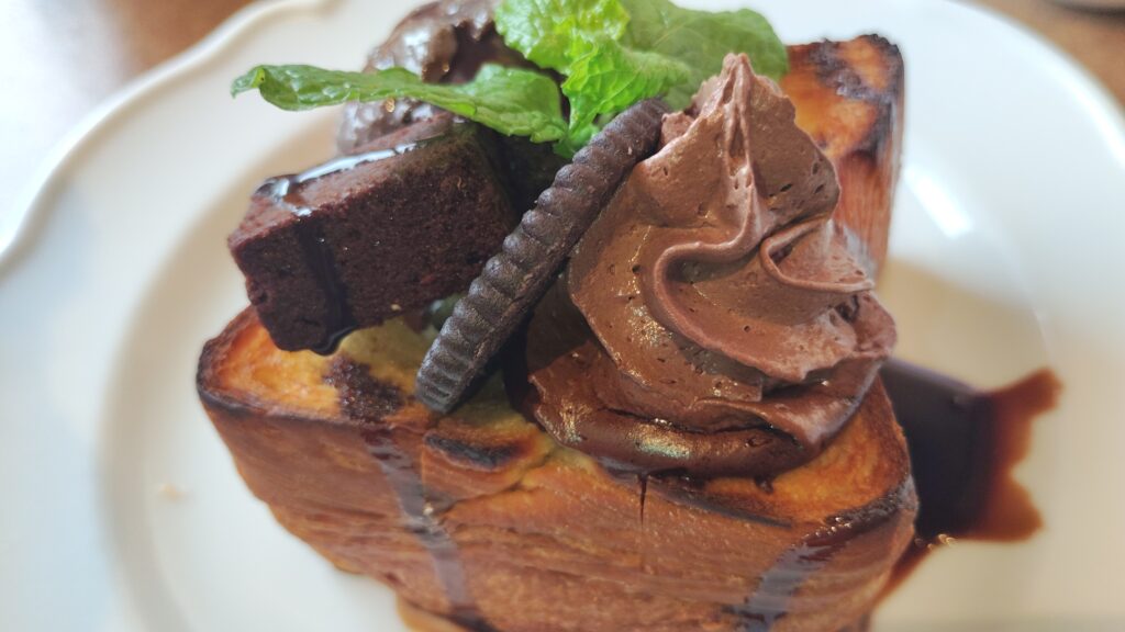 今回注文したのは「チョコレートハニートースト」。チョコソースがたっぷり+チョコジェラート+ブラウニー+チョコクッキー+チョコポイップとチョコ尽くしが特徴です。添えられたジェラートとの組み合わせで、見た目から楽しめます。