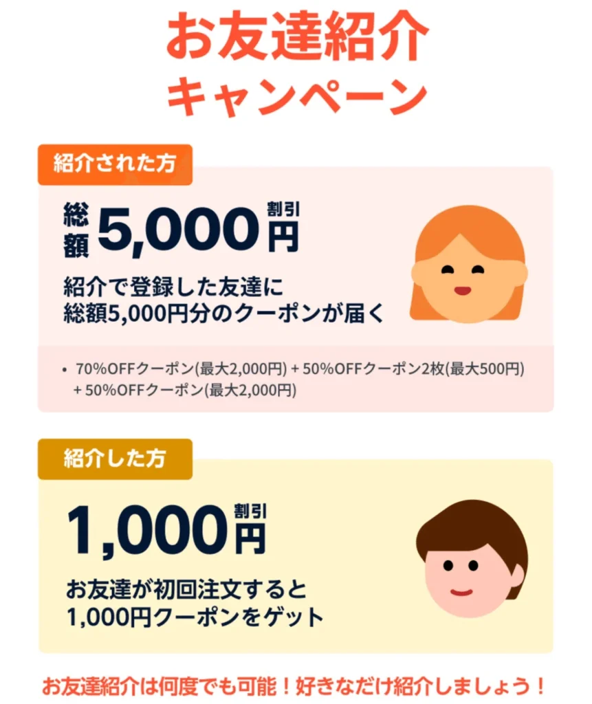 - 紹介された人:初回購入は最大70%OFFクーポン(最大2000円まで)、総額5000円分のクーポンプレゼント