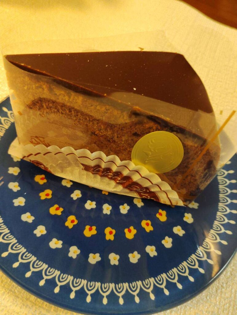 背面のチョコレートが、なんというか変わった味で、外国のチョコレートという感じがしました。スポンジやクリームが甘さ控えめな分、外側のチョコレートの独特な味わいがたまりません。