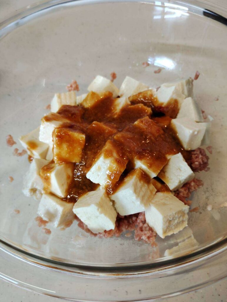 2,挽肉の上に2㎝角に切った豆腐をのせる