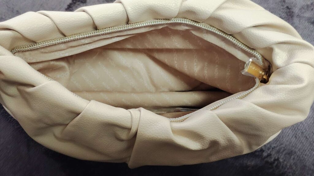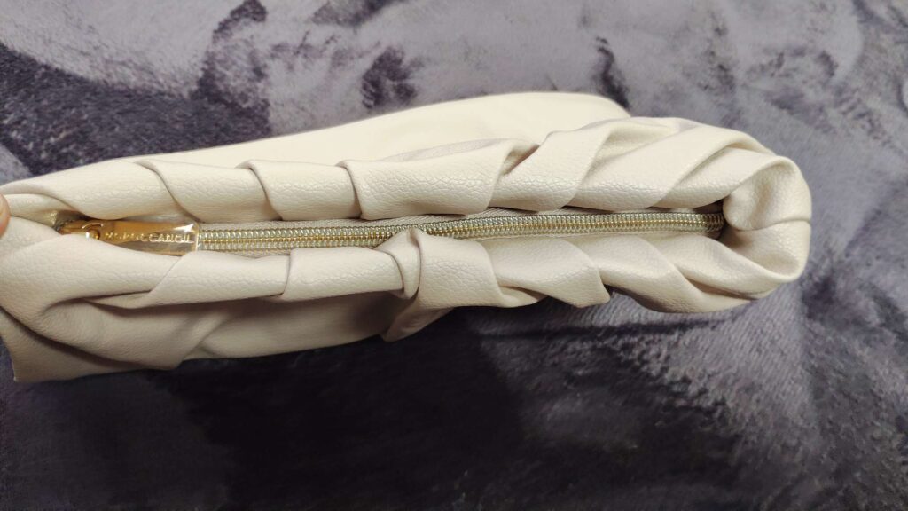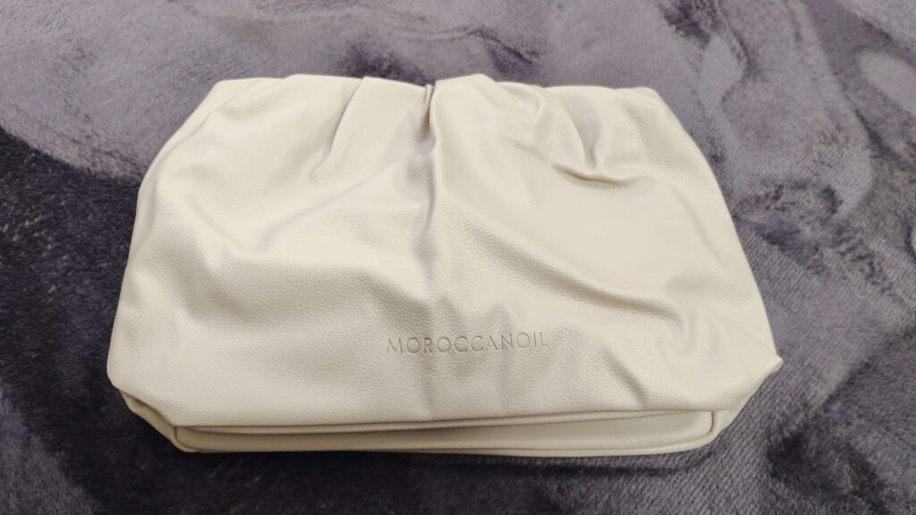 ポーチはモロッカンオイルとブラシがちょうど収まるサイズ感。旅行や温泉、ジム用のヘアケアポーチとして使いやすく、オイルを持ち運ぶときも安心です。