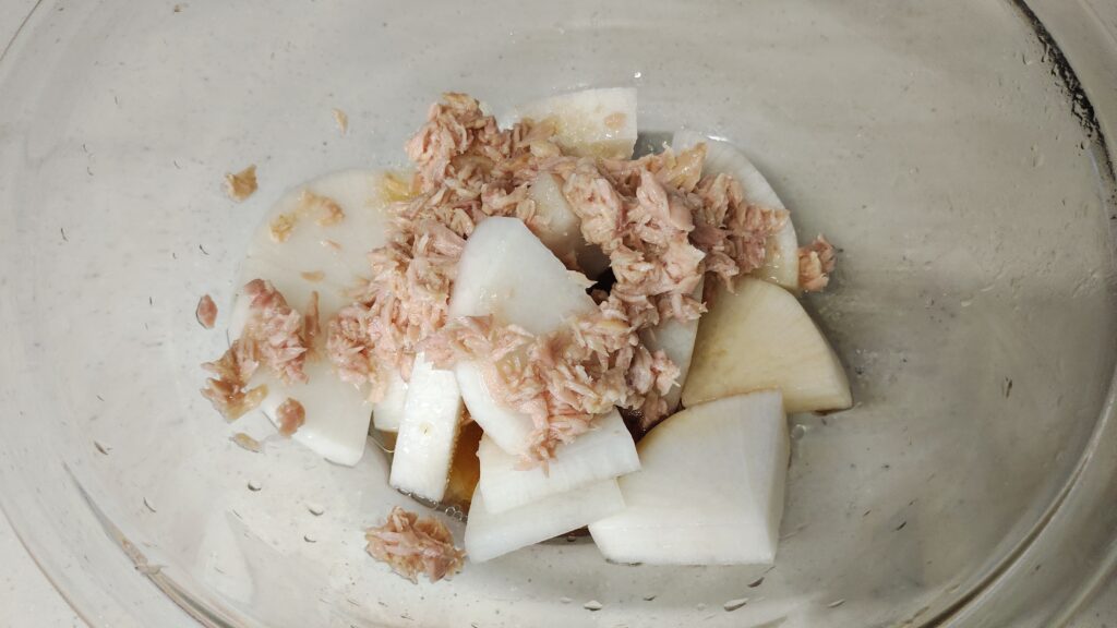 2.耐熱ボウルに大根・ツナ・調味料を入れ、軽く混ぜる。