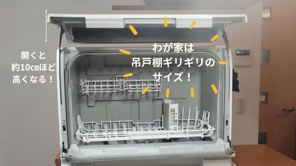 扉は開けると上方向に持ち上がる構造のため、本体の上に約10cmほどの空間が必要です。