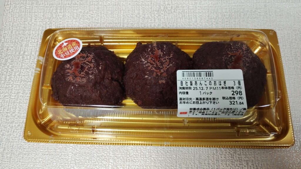 スーパー「オリンピック(Olympic)」のお惣菜コーナーで見つけた「自家製あんこのおはぎ」。今回は3個入りを購入したので、じっくり味わいながらレビューします。