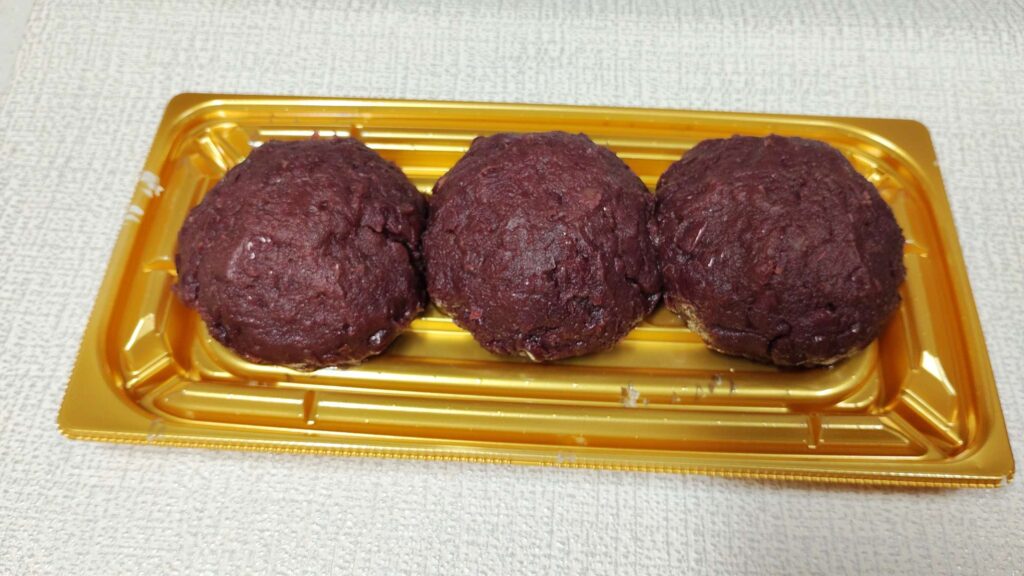 私が今回購入したのは「自家製あんこのおはぎ 3個」です。透明のパックに3つ並んでいます。見た目からしてずっしり重そう。