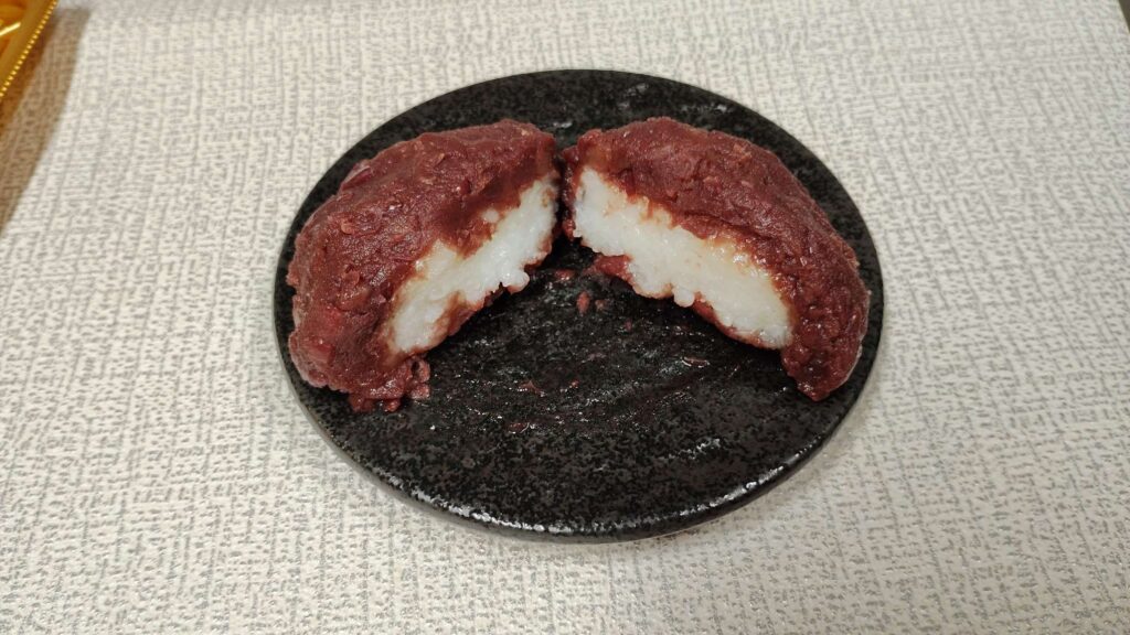 半分に割ってみると、あんこの厚さに驚きます。もち米よりあんこのボリュームのほうが多いくらいで、まさに“あんこ好きのためのおはぎ”。