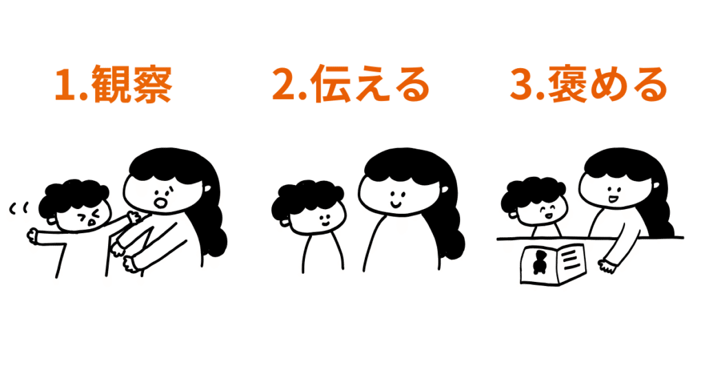 「どんな行動をしているのか丁寧に観察する」「してほしい行動を短く具体的に伝える」「できたらすぐに褒める」