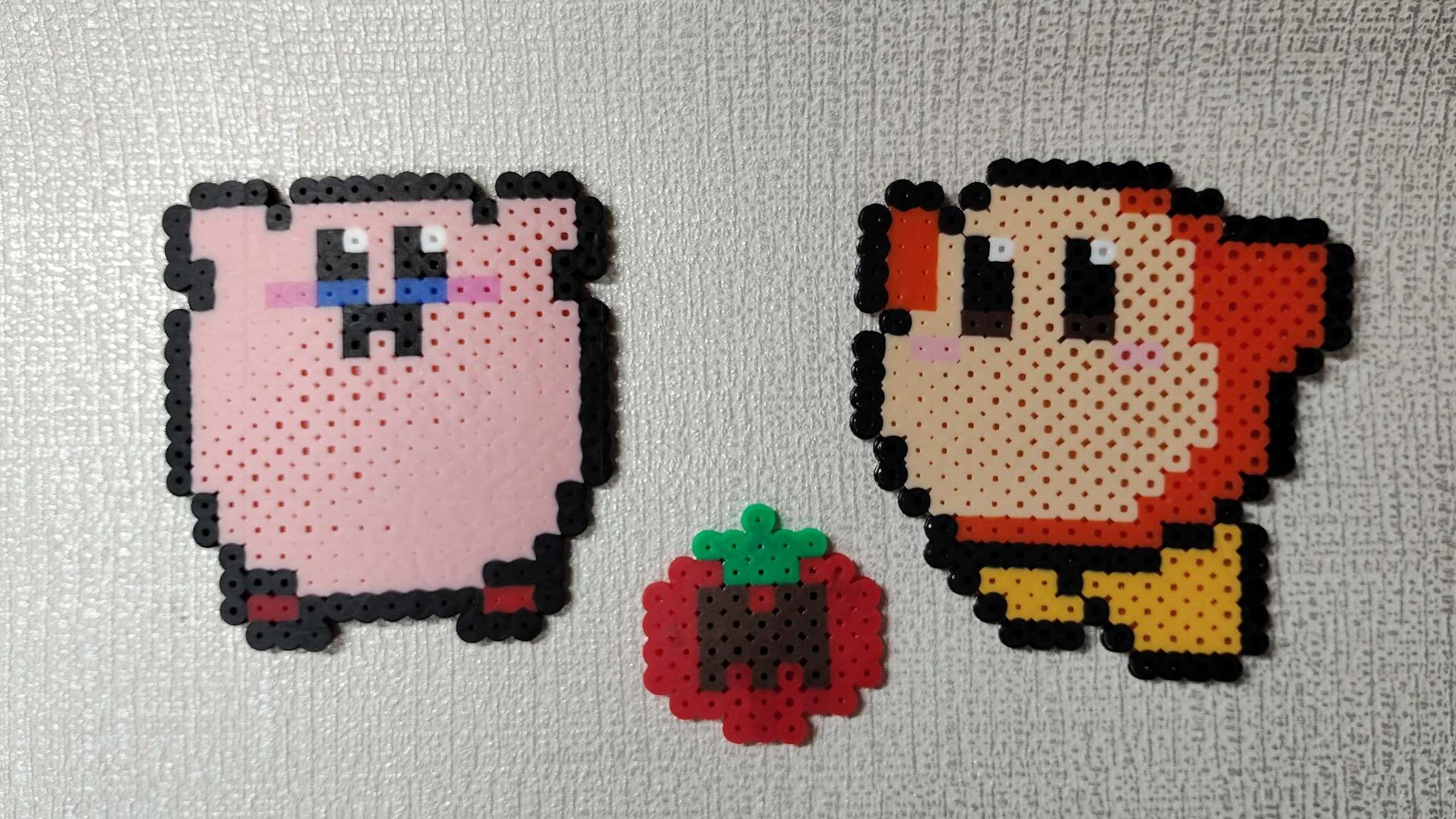 左のワドルディはダイソーのビーズ、マキシマムトマトとカービィ―はパーラービーズで作りました。