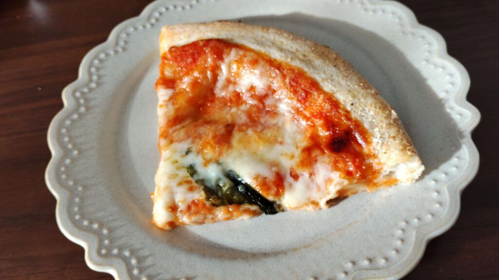 口に入れるとチーズのコクとトマトソースの甘酸っぱさが絶妙にマッチ。クラストは外はサクッ、中はもっちりで、食感のバランスも抜群です。バジルの風味が全体を引き締め、最後まで飽きずに楽しめる一枚です。