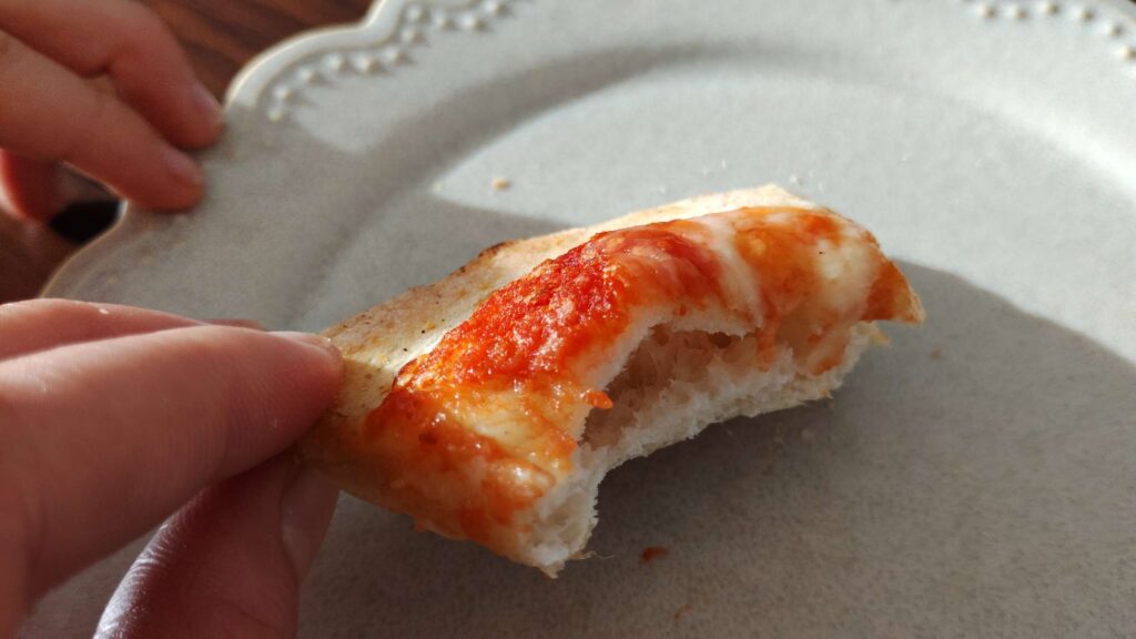 焼きたては、チーズの香ばしい匂いとトマトのフレッシュな香りが合わさり、お店のピザ感たっぷり。チーズがとろ〜り、トマトソースがほどよく赤く映えます。