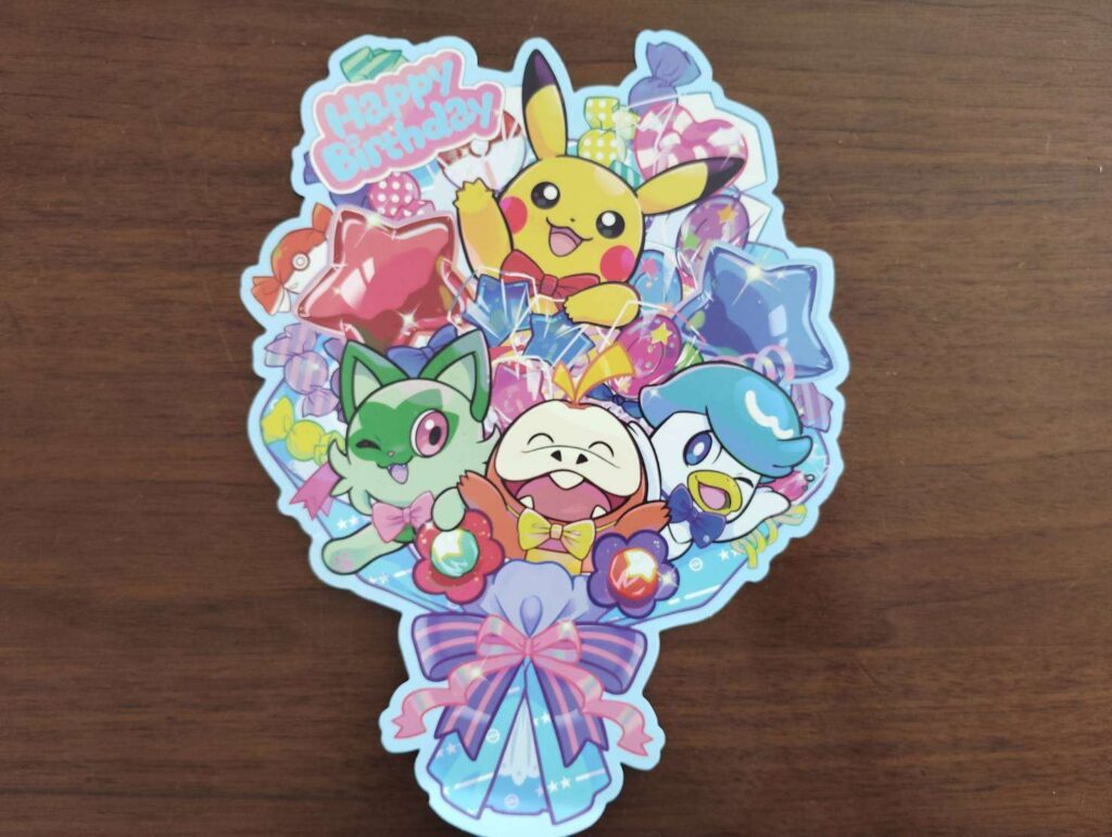 ピカチュウやイーブイたちが花束を持ってお祝いしてくれている、とっても可愛いデザインのカードです。