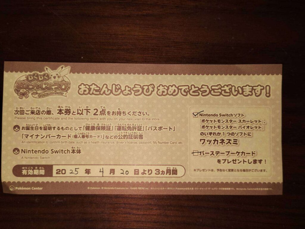 プレゼントを受け取るには、ご自身のお誕生日を証明できるもの(運転免許証、健康保険証、パスポート、マイナンバーカードなど)と、ニンテンドースイッチ本体(またはNintendo Switch Lite本体)が必要なので、忘れずに持っていきましょう!