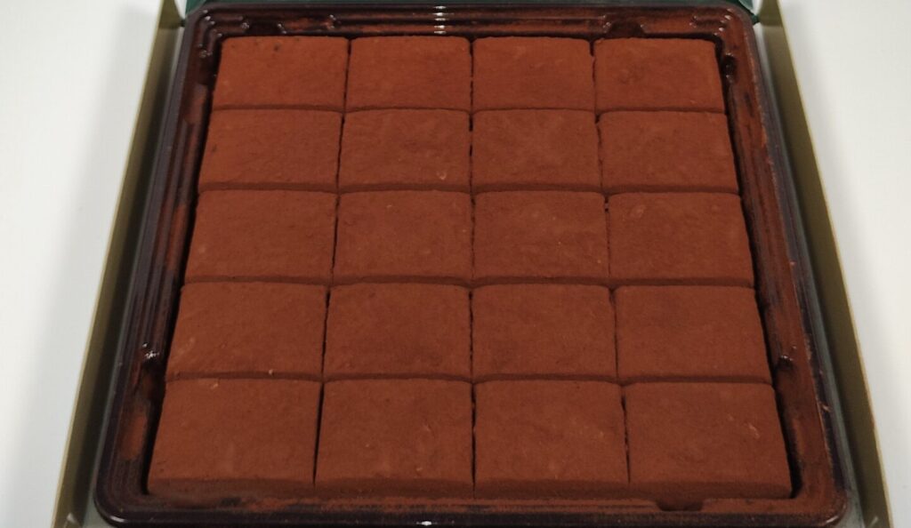 一粒ずつ丁寧に並べられた生チョコは光沢となめらかな表面が美しく、食欲をそそります。ロイズのチョコレートはしっかり硬めで崩れることがありません。