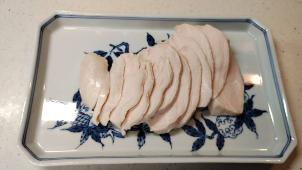 お鍋から取り出し予熱がとれるまで放置したら、サラダチキンが完成!