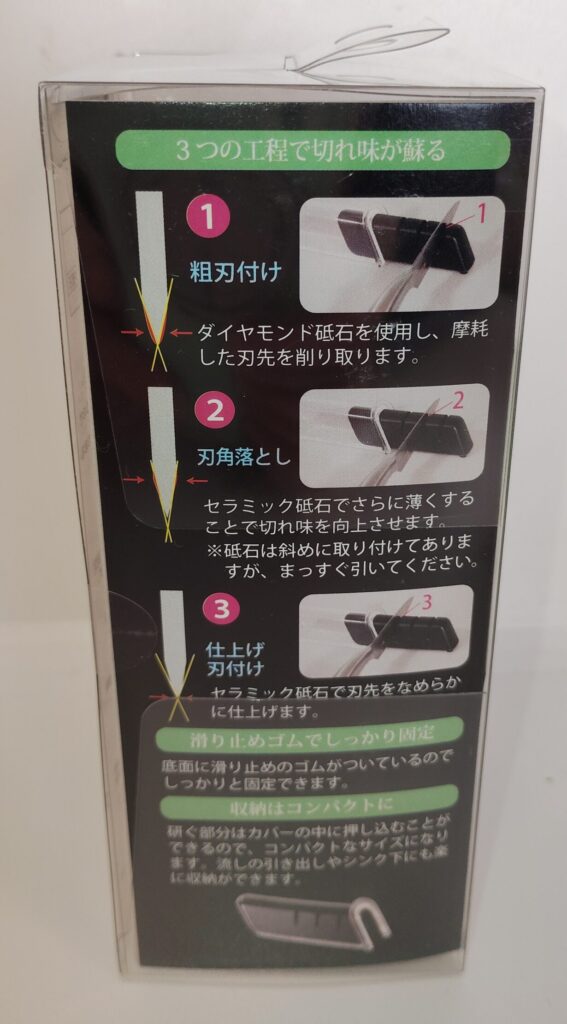 ダイヤモンド砥石で荒研ぎをし、セラミック砥石で仕上げ研ぎを行う3段階構造になっています。包丁を軽く数回引くだけでOKなので、砥石初心者でも安心です。