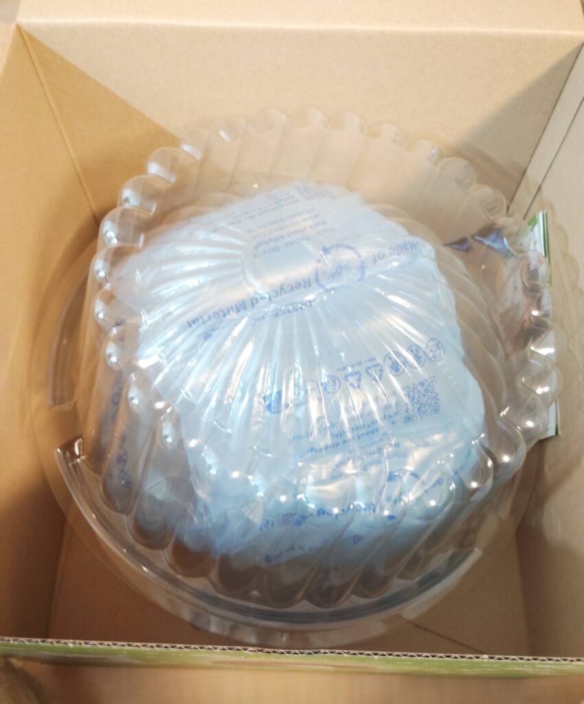 届いた箱を開けると、栽培ブロックと透明カバー、説明書が入っています。