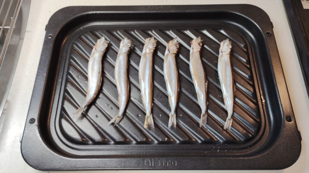 - ししゃもを重ならないようにグリル皿に並べ、上段に入れる