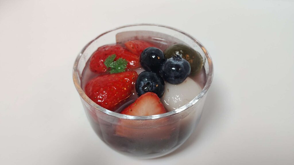 2色の白玉もトッピング。全部で3つ入っていました。常温で食べましたが、白玉はやや硬めでしっかりめの食感。緑色はたぶん抹茶味です。