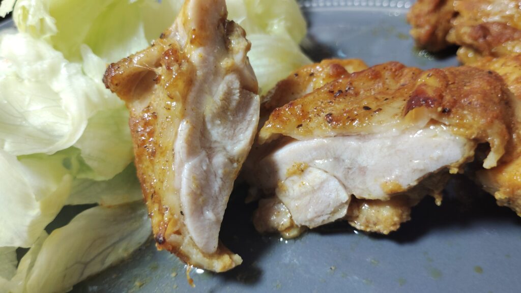 焼き上がったタンドリーチキンは、香ばしいスパイスの香りが食欲をそそります。外はこんがり、中はジューシーに仕上がっています。ヨーグルトのおかげで鶏肉が柔らかく、スパイスも程よく効いています。焼きムラもなく全体が均一に焼かれていました。