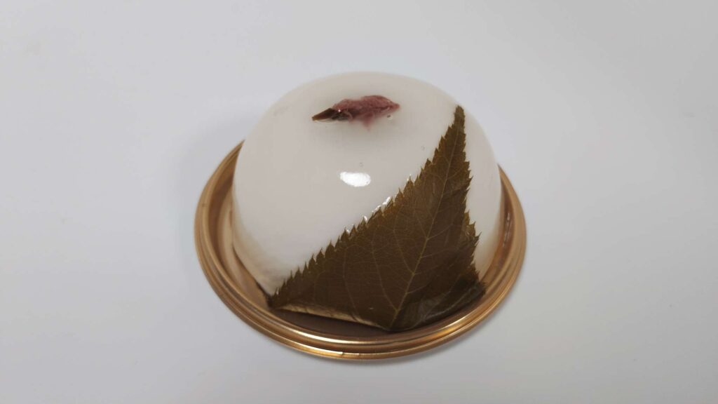 カットすると、ぷるんとしたムースの中からいちごのジュレがのぞきます。桜の葉と花びらがアクセント。口に入れると、やさしい甘さの中にほんのりとした塩気が重なります。