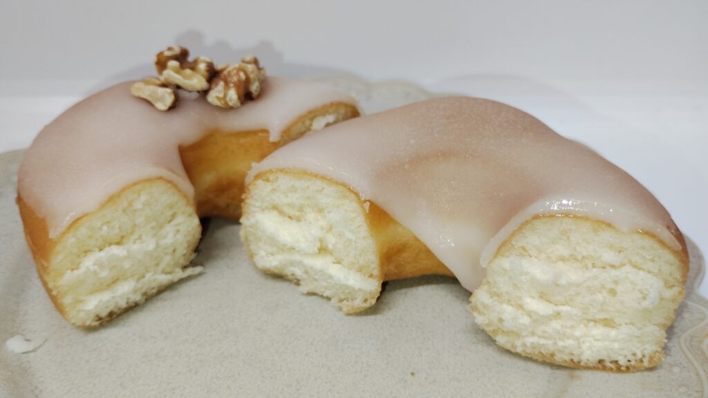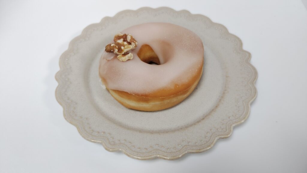 ふっくら軽い口あたりのドーナツに、はちみつ風味豊かな甘いグレーズがかかっています。香ばしいくるみをトッピング。