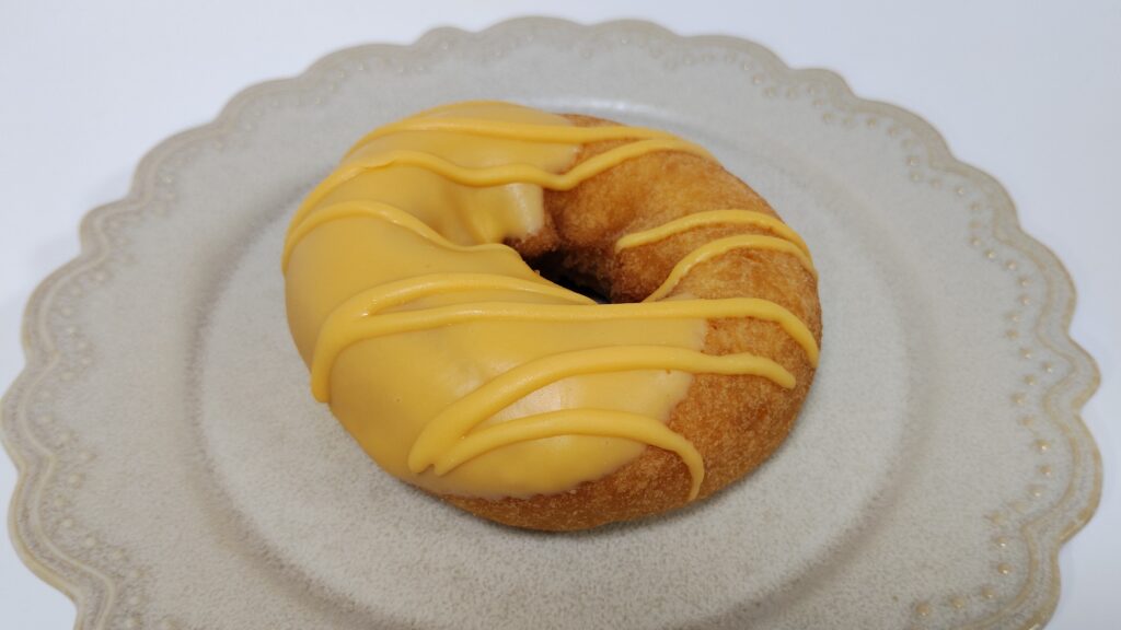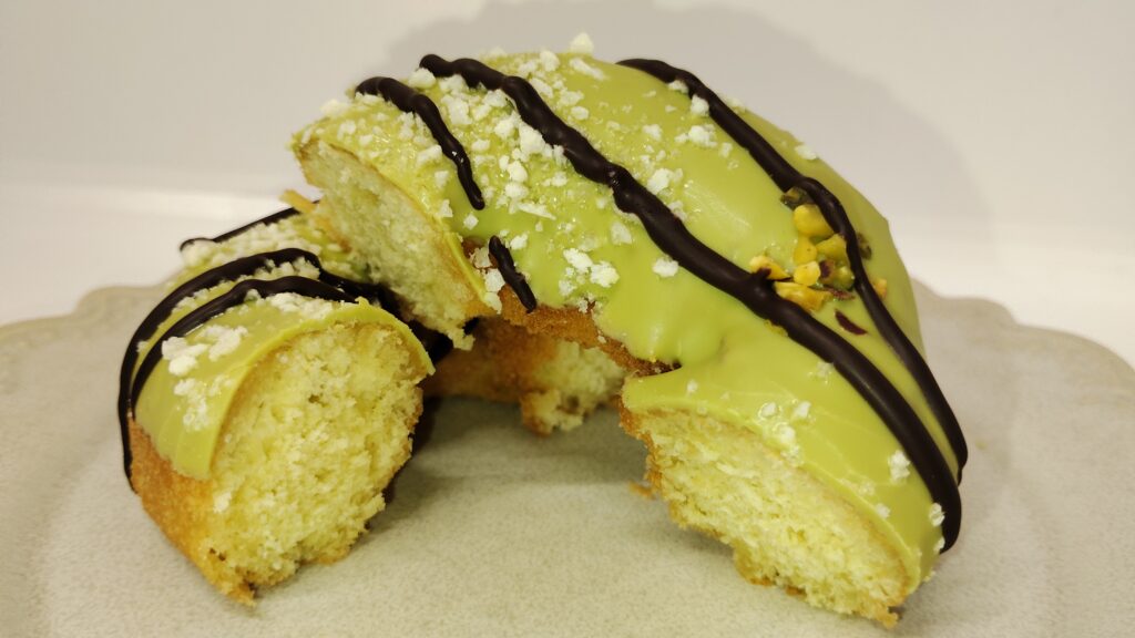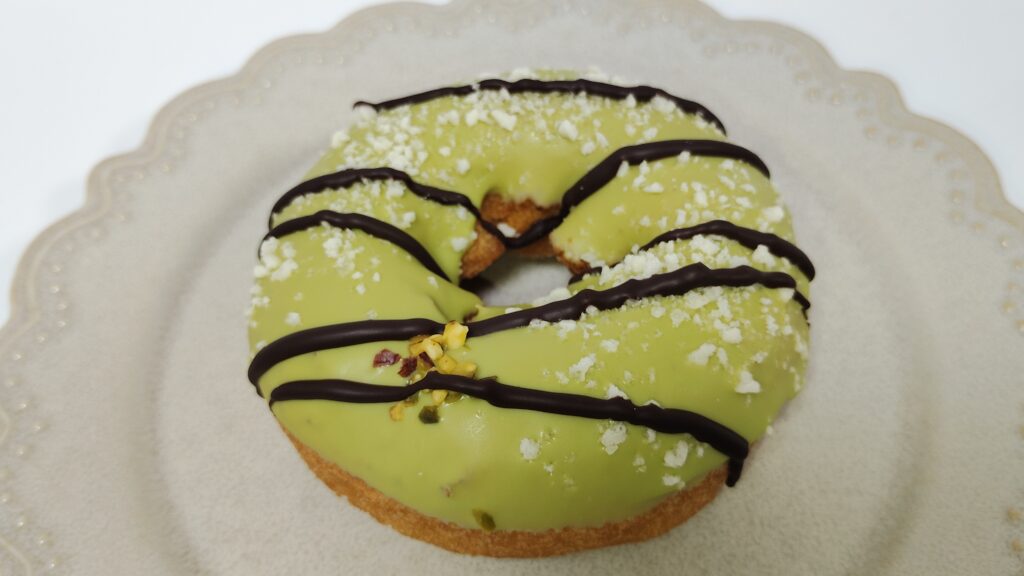 ピスタチオの香ばしさとコクのある甘みが特徴で、見た目もおしゃれ。上に散りばめられたナッツがアクセントになっています。ドーナツ生地はしっとり系。